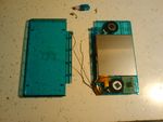 That should leave just the top LCD and the attached speakers. Yes, the speakers are both soldered to the ribbon cable. These should pop out together quite easily, although you will need to peel the screen protector off of the screen carefully. Leave the protector in the shell for now, so as to avoid getting it stuck to anything. One of the little black speaker insulators stayed on the speaker, so you only see one in the photo. Note that the wiring of the speakers isn’t identical. We’ll be soldering these to the new ribbon cable side-by-side so as not to confuse this.
